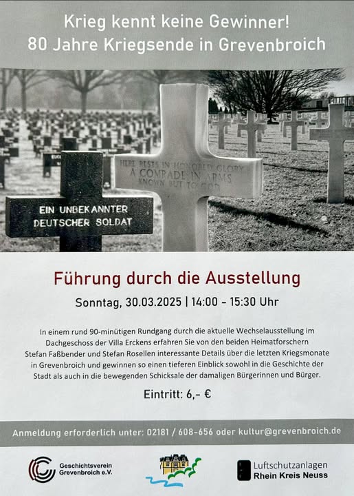 Als Begleitprogram zur Ausstellung "Krieg kennt keine Gewinner! 80 Jahre Kriegsende in Grevenbroich" führen wir zusammen mit dem Verein Luftschutzanlagen im Rhein Kreis Neuss e. V. durch die Ausstellung im Dachgeschoss der Villa Erckens. Wegen der begrenzten Personenanzahl im Dachgeschoss ist eine Anmeldung dringend erforderlich unter: 02181/608-656 oder kultur@grevenbroich.de