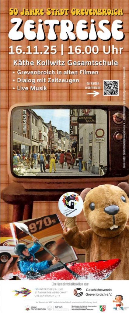 Die “kommunale Neugliederung” verschob in Nordrhein-Westfalen Stadtgrenzen und Zuständigkeiten. Von 1966 bis 1975 dauerte diese Gebietsreform und seit 1975 gehört Grevenbroich zum Rhein-Kreis Neuss. Seitdem ist viel passiert, unsere Stadt hat sich verändert. Am 16. November 2025 starten wir eine unterhaltsame Zeitreise mit Episoden aus Filmen dieser Epoche. Drei Themen stehen dabei im Vordergrund: • … „50 Jahre Stadt Grevenbroich Zeitreise“ weiterlesen